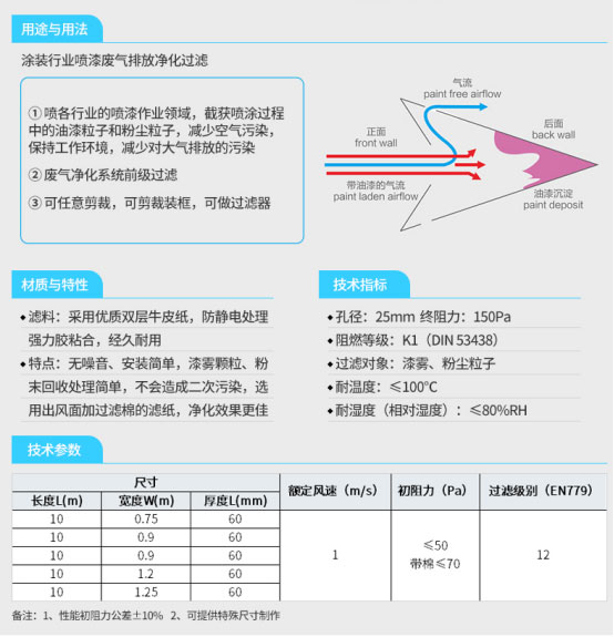 V型干式過濾紙,又稱油漆過濾紙,漆霧過濾紙、折疊式過濾紙板。是使用于干式噴漆房內的一種環保型產品,可有效過濾油漆類,油類,玻璃原料,環氧樹指,柏油,鐵弗龍,液化工件,塑膠,烤瓷,染料,涂裝類廢氣顆粒,過濾效果高達90%以上,在噴房工作環境要求較高或者濕度較大時使用仍然有效果。