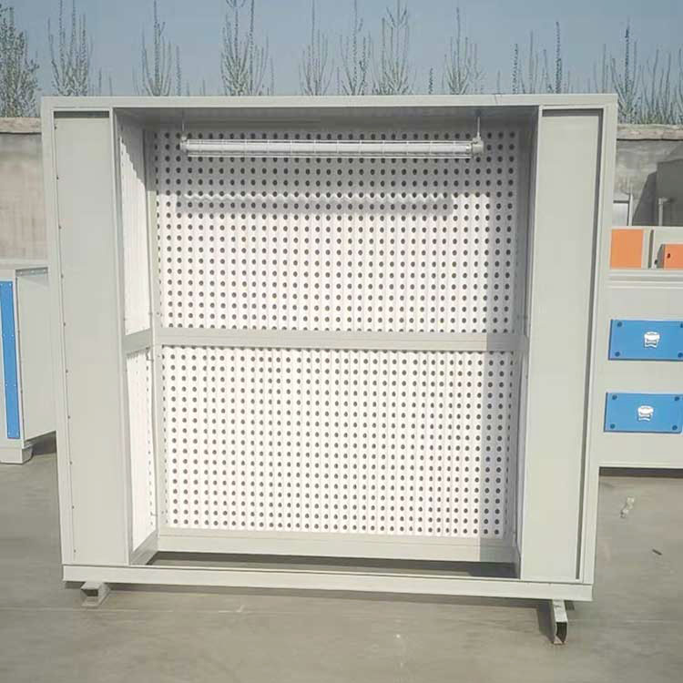 環保干式噴漆柜,用折流式過濾紙、玻纖過濾棉相結合方法,可有效吸收超范圍的噴涂漆霧。過噴氣流先經過折流紙,使氣流多次改動流動方向,這樣那些比空氣重的顆粒會粘附在折流板壁上,不會隨氣流而帶走,部分細微顆粒經過纖維過濾棉進行二次過濾,漆霧凈化作用高達98%以上。去除漆霧的有機氣體再經過活性炭吸附箱或光氧催化設備凈化后高空排放。