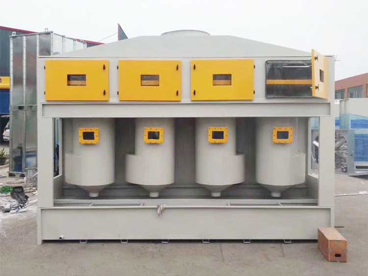 3米長水旋柜四、氣旋噴漆柜亦叫氣旋混動(dòng)噴漆柜,氣旋混動(dòng)噴漆水簾柜,氣旋水簾柜噴漆設(shè)備。氣旋噴漆柜作業(yè)時(shí),粉塵或廢氣在負(fù)壓風(fēng)機(jī)牽引力的作用下,噴漆噴膠產(chǎn)生一部分乳化性廢氣顆粒隨水簾落到水池中,大部分廢料進(jìn)入高速旋流導(dǎo)軌裝置,漆霧、旋風(fēng)與水在高速旋轉(zhuǎn)的進(jìn)行氣液乳化反應(yīng)。氣動(dòng)混流裝置的高速運(yùn)轉(zhuǎn),使得漆霧與旋轉(zhuǎn)液體充分混合,在離心力的作用下達(dá)到漆液分離。氣旋桶內(nèi)部采用水泵循環(huán)給水,由安裝在隔水層底部的螺旋噴嘴噴出來,漆霧分離出來的粉塵顆粒物下沉到水箱底部,分離后的氣體進(jìn)入環(huán)保填充料隔水層,然后進(jìn)入后段的廢氣處理設(shè)備。