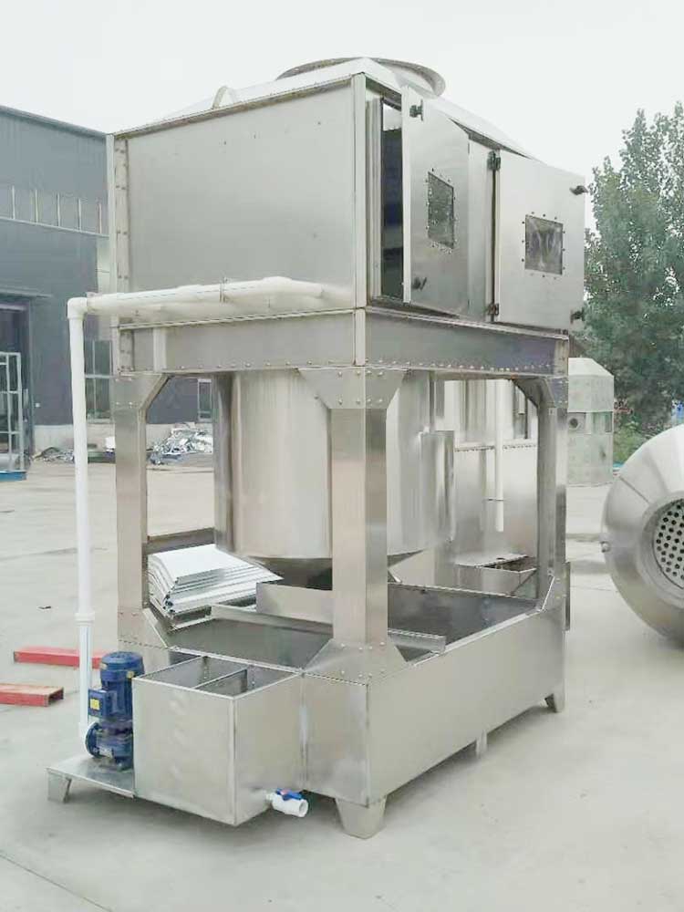 含塵廢氣由風管引入凈化塔,經過旋轉洗滌桶時風帶加快,帶動填料球飛帶運轉,在洗滌桶里,含塵廢氣與水霧沖鋒混合洗滌、中和反應(水里面補充有酸堿時),廢氣經過凈化后,再經除霧層脫水除霧后由風機排入大氣或再進入其他凈化設備(光氧催化、低溫等離子等)、吸收液再塔底經水泵增壓后在箱頂噴淋霧化而下,***后回流至箱底循環使用,凈化后的廢氣達到國家排放標準。