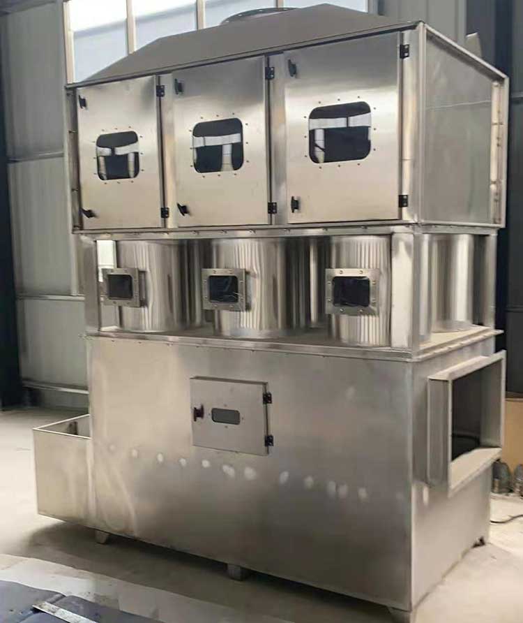 2、旋流板除塵塔內安裝有多個“圓形旋流桶”和高效除霧板。旋流桶內放有實心填料球,用來凈化粉塵或粘性廢氣,***上層的除霧板用來凈化水霧,達到去除水霧的目的,經引風機引入的廢氣在塔內旋流上升、并在各板上與由塔頂進入的液體旋流接觸,完成除塵、脫硫任務。旋流板塔在離心力的作用下,煙氣中的顆粒物沉入水池, ***后由人工撈出清理,同時塔內的水可以繼續循環使用,不會造成污染。經過凈化的廢氣,再經過后繼凈化設備處理,使之達到國家排放標準。