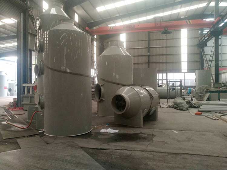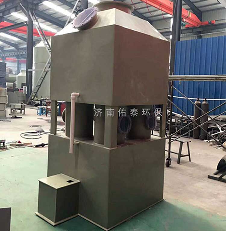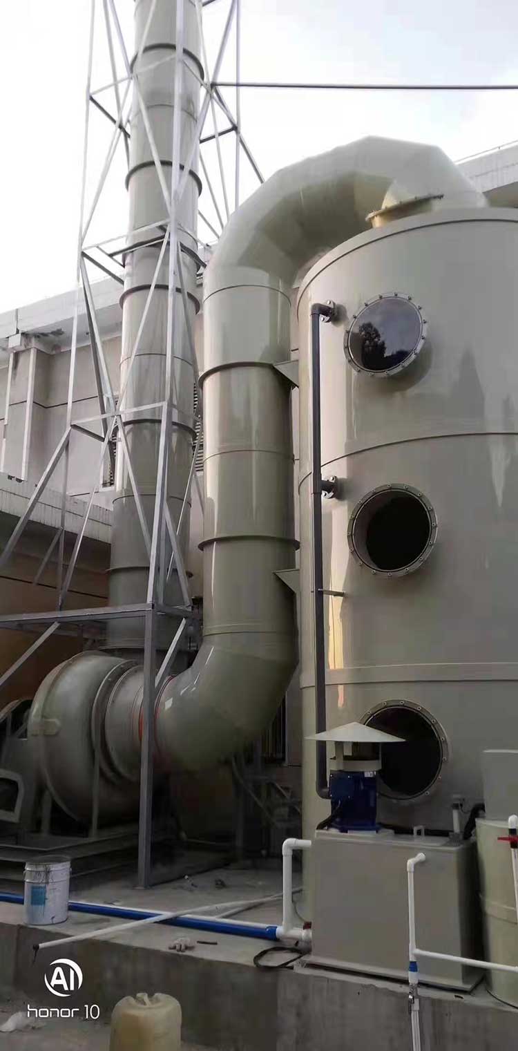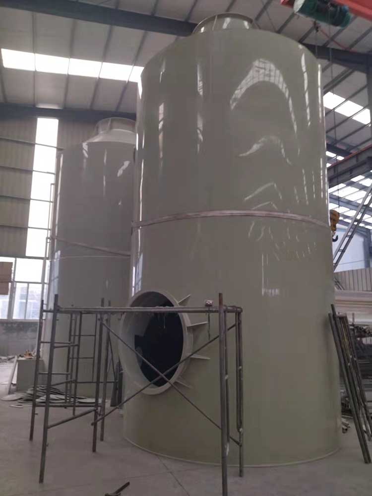 1.5萬風量pp噴淋塔塔規格為:ф1.8m*H4.0m*10mm。進、出風口直徑均為600mm。循環水量每小時22立方。每小時處理廢氣量15000立方左右。凈化塔整體厚度為8mm PP板。塔體內部有二層水噴淋裝置,三層浮球填充,帶水箱和2.2KW純銅芯普通循環水泵。