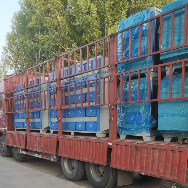 活性炭吸附環保箱尺寸:L3.1*W1.15*H1.7(m),1.8mm鍍鋅板制作,外表噴塑。共16個活性炭抽屜,640塊(L10*W10*H10)活性炭磚。進風口一道玻纖過濾網,出風口一道活性炭過濾棉。活性炭碘值400。