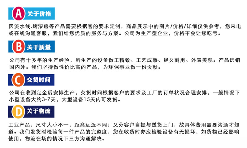 公司的環保設備有VOCs廢氣處理設備、工業粉塵處理設備兩大類。廢氣治理環保設備有催化燃燒設備pp噴淋塔活性炭吸附箱、移動伸縮噴漆房、氣旋塔、水簾噴漆柜、漆水分離一體機等環保設備。粉塵處理設備包括濾筒式脈沖除塵器、布袋除塵器打磨吸塵工作、水簾式打磨臺等設備。我們可以根據企業的實際情況定制合適的環保設備。歡迎您來電咨詢15665879292,或者添加網頁下面微信,把您的廢氣治理需求告訴我們,我們為您提供設備的詳細參數、配置及價格,為你提供相關設備的案例圖片或視頻,同時可以給您發公司車間正在加工設備的視頻或圖片。