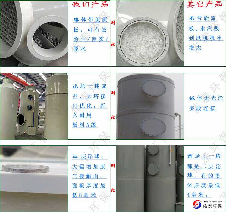 2、本公司噴淋塔配有三層浮球,二層噴淋,旋流板,及芯銅電機水泵,板料使用A級板。可按要求定制。
