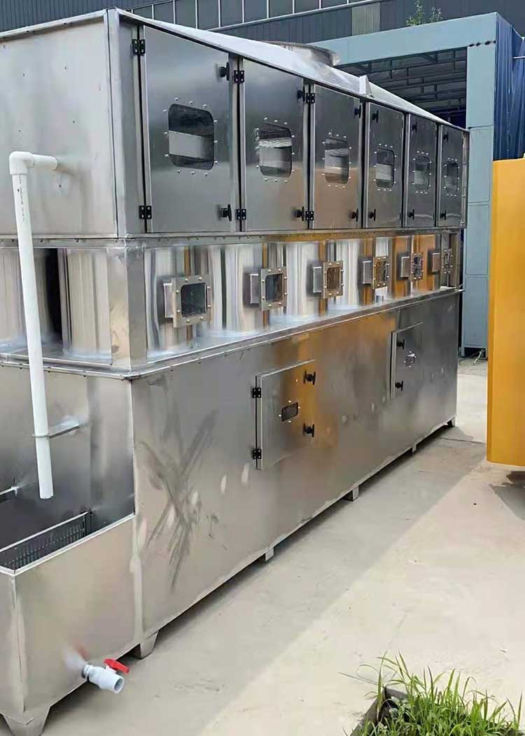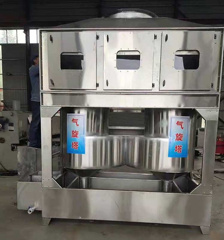 需要處理的含塵廢氣由風管引入凈化塔,經過旋流塔洗滌桶時,風帶加快,帶動填料球飛快運轉。在洗滌桶里,含塵廢氣與水霧充分混合洗滌,中和反應(水里補充有酸堿時)廢氣經過凈化后,再清除霧層脫水除霧后由風機排入大氣或再進入其他凈化設備(光氧催化、低溫等離子等)。吸收液在塔底輕水泵增壓后在箱頂噴淋霧化而下,***后回流直箱底循環使用,凈化的廢氣達到國家排放標準。