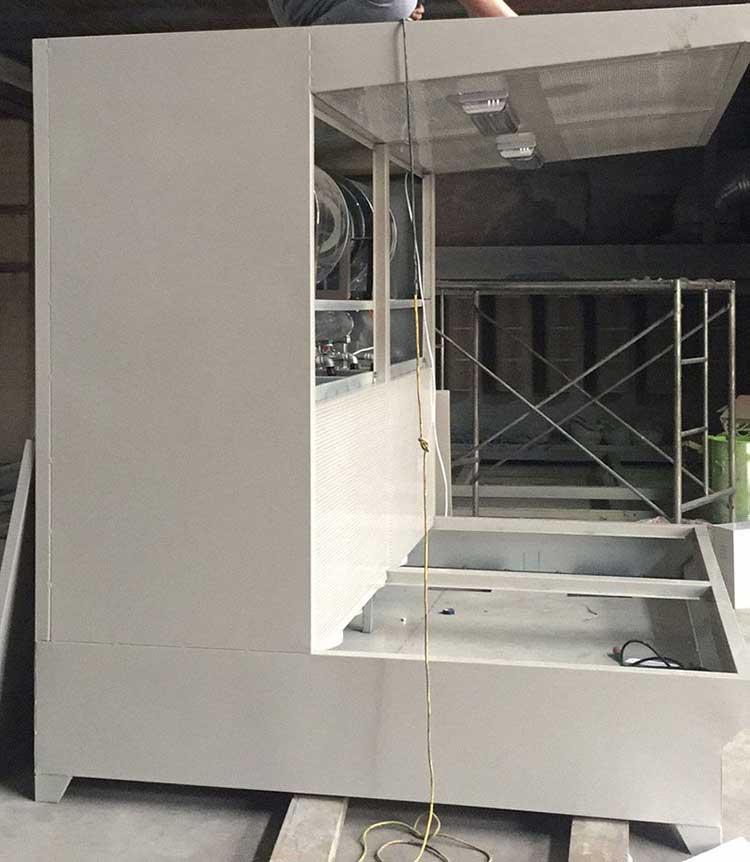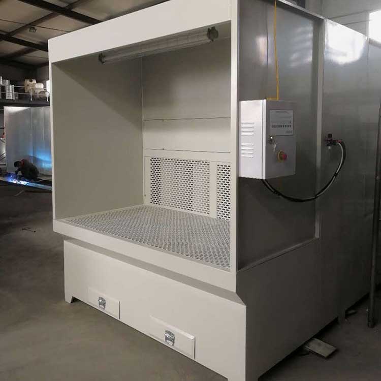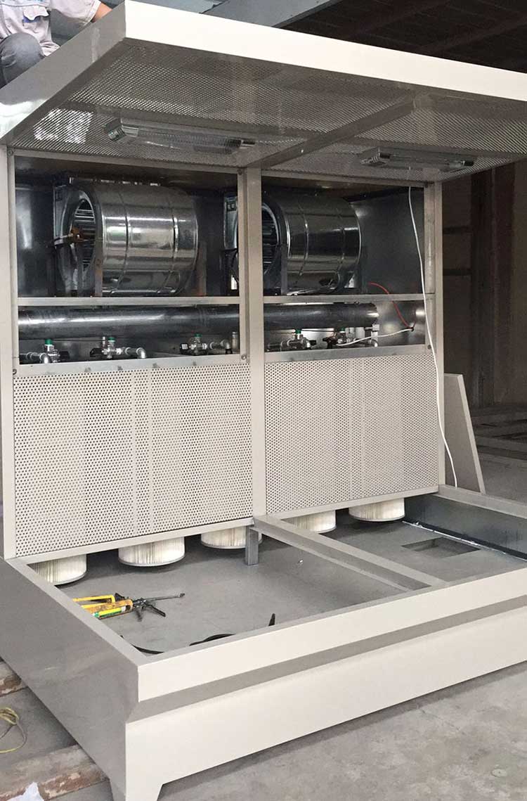 多工位打磨吸塵工作臺工作時,把工件放在工作臺面上打磨,在排風機的抽吸作用下,將工件上打磨出來的粉塵、灰塵等物吸入機內,打磨出來的粉塵不會在操作者的呼吸處停留,而隨抽風的氣流迅速抽進主機里,帶有粉塵的氣流通過百味窗透過濾芯排風過濾系統流向機外,粉塵顆粒經過濾芯過濾后掉下主機的集成箱里,干凈的空氣排出。還有一部分氣體通過回風道經過風口棉,再次過濾吹到工作臺面,從而達到循環的***佳效果。這樣大大改善了工作環境。