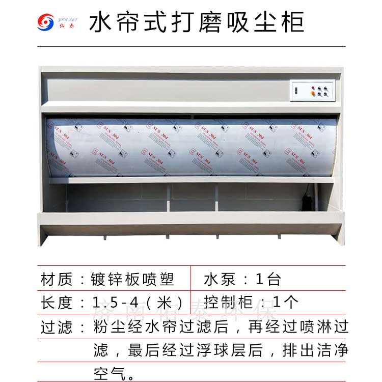 水簾式打磨柜是濕式打磨除塵設備的一種,是相對于干式除塵柜而言的另一種除塵設備,其目的都是達到凈化空氣,改善工人工作環境,保護環境的目的。水簾附塵柜是一種成本比較低廉的環保設備。根據工作空間的要求,可定制不同尺寸的水式打磨柜。水式打磨吸塵柜由柜體、風機、水簾板、水泵、控制開關組成。本產品耗能少,吸附能力強,維護方便,專門為家具打磨,石粉打磨等,提供良好的工作環境。